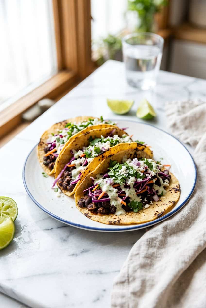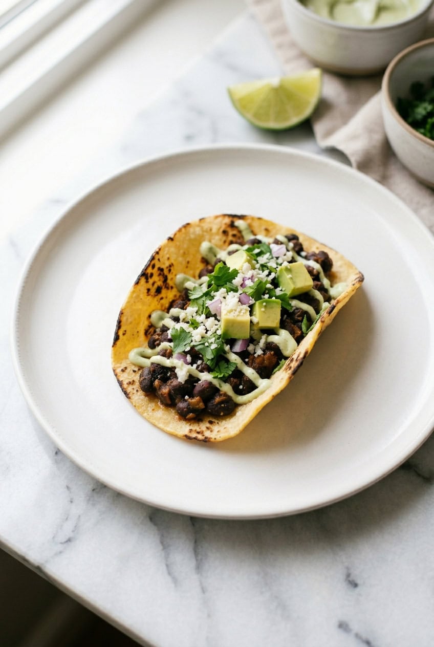 Quick and flavorful vegetarian tacos with seasoned black beans, fresh avocado, cilantro, and lime crema.