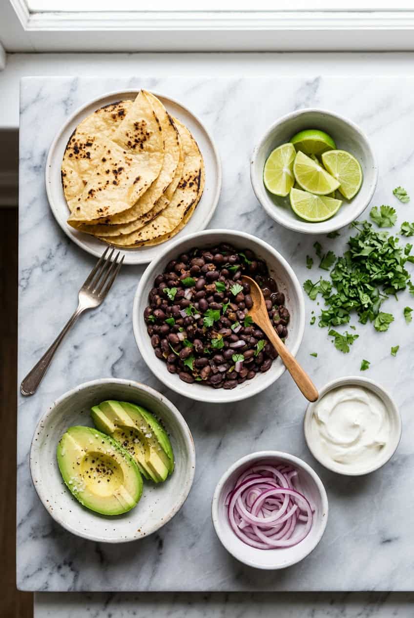 - Assemble. Spoon the seasoned beans into each tortilla. Top with diced avocado, red onion, cilantro, and a drizzle of sour cream.