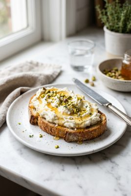 Cloud-like whipped ricotta spread thick on crunchy toast, drizzled with honey and topped with pistachios. [...]