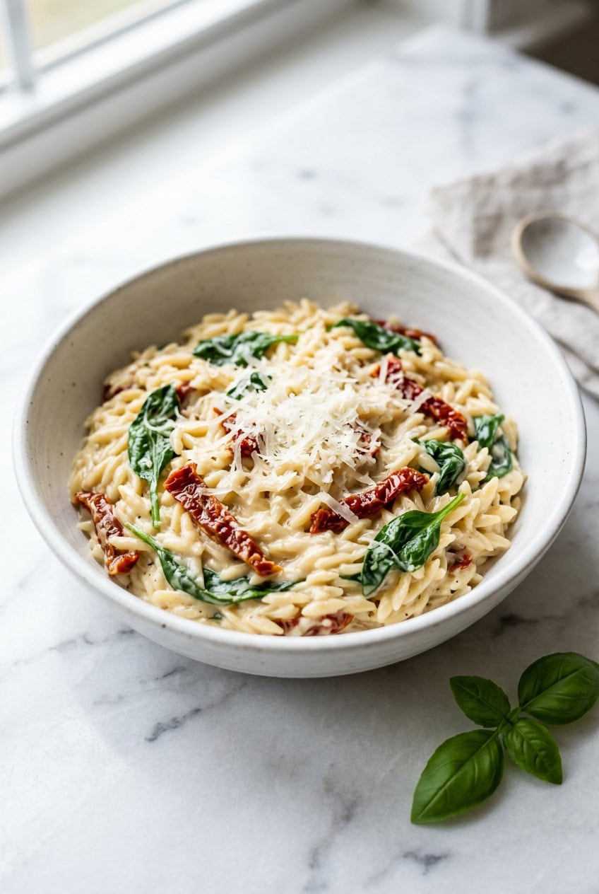 This orzo works because cooking it directly in the broth and cream means it absorbs all that flavor as it cooks, almost like a pasta risotto. The sun-dried tomatoes add a tangy sweetness, the spinach wilts in at the end, and the parmesan ties everything together into a silky, cheesy sauce.