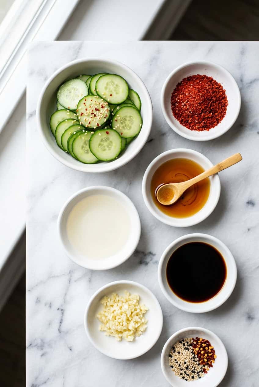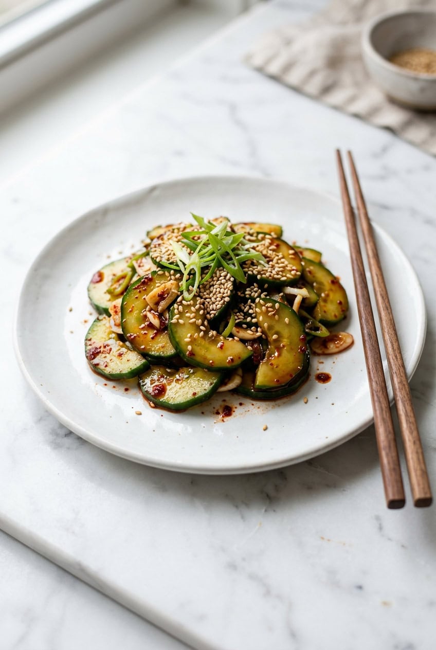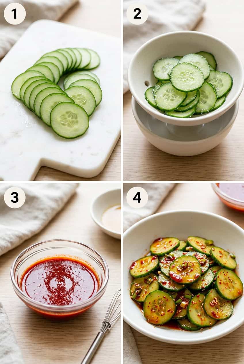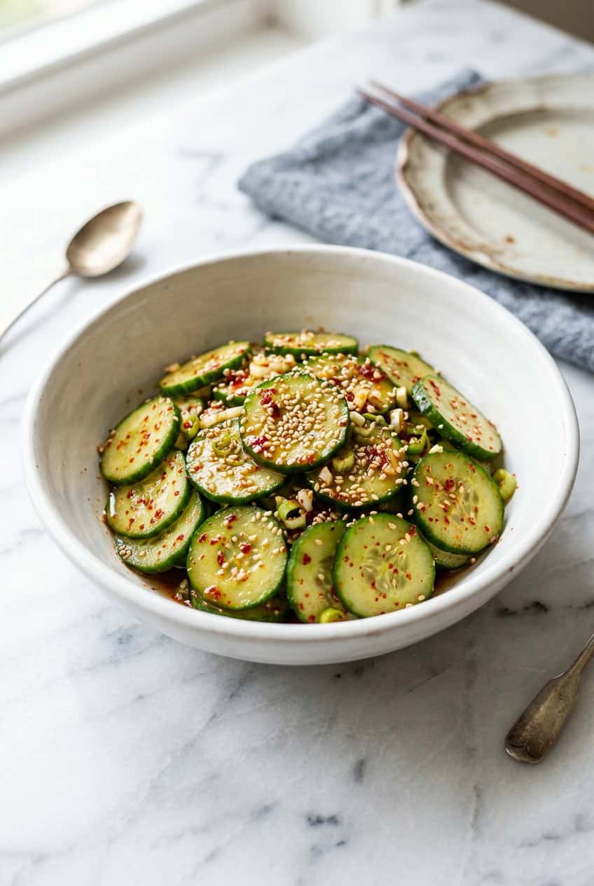 This salad works because the gochugaru brings a slow, smoky heat while the rice vinegar and sesame oil create a tangy, nutty backbone. Salting the cucumbers first draws out excess water so the dressing clings to every slice instead of pooling at the bottom of the bowl.
