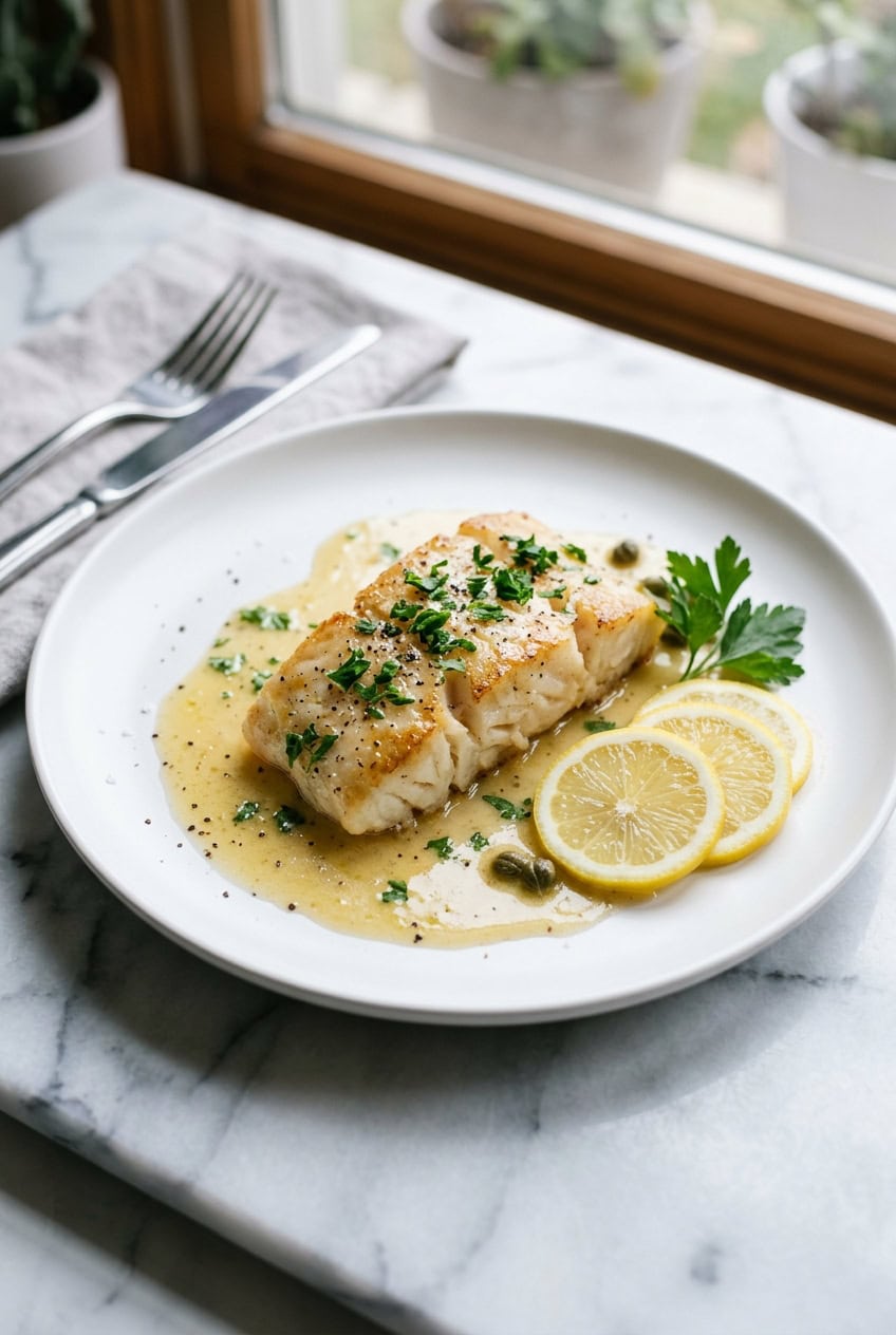 - Finish. Squeeze lemon juice into the pan and swirl to combine with the butter. Spoon the sauce over the cod, sprinkle with fresh parsley, and serve immediately.