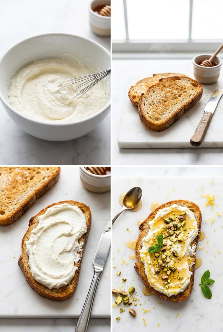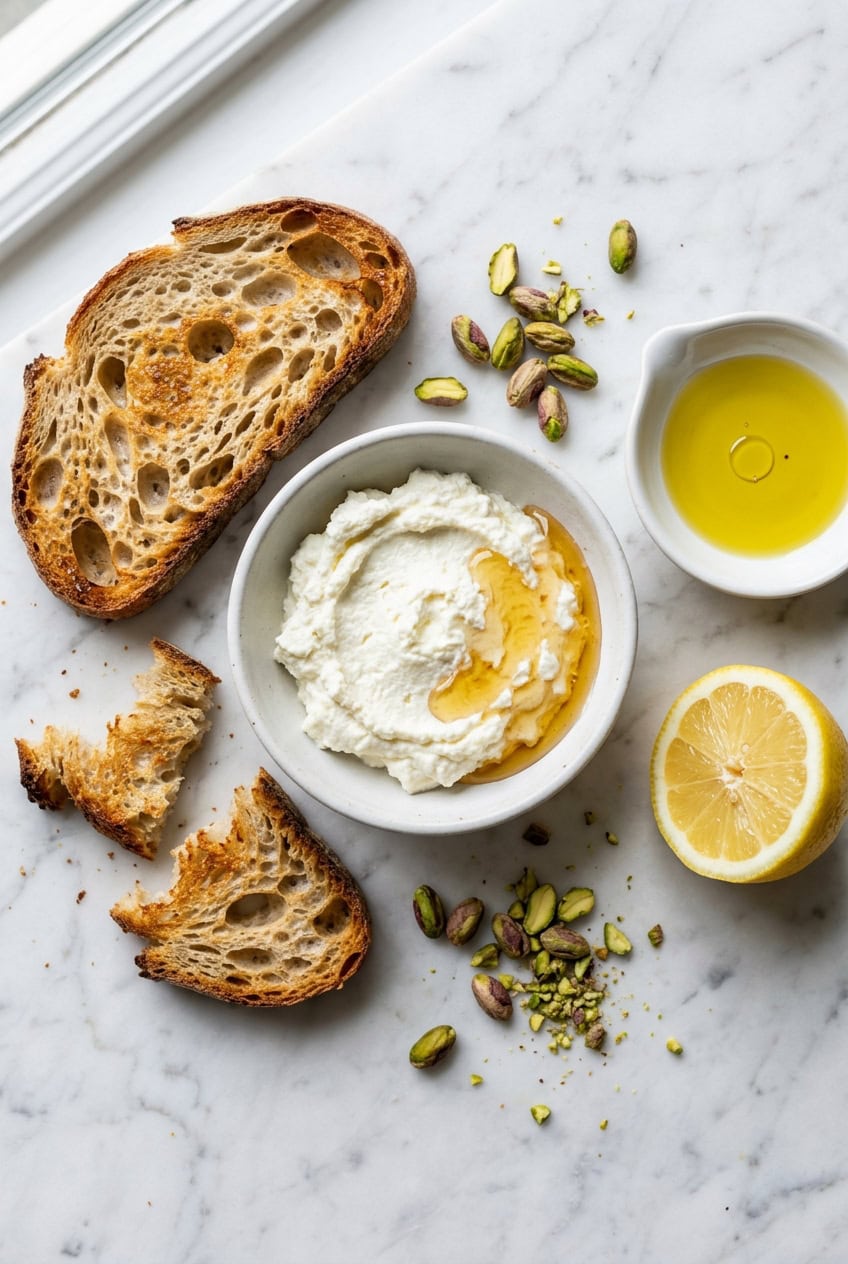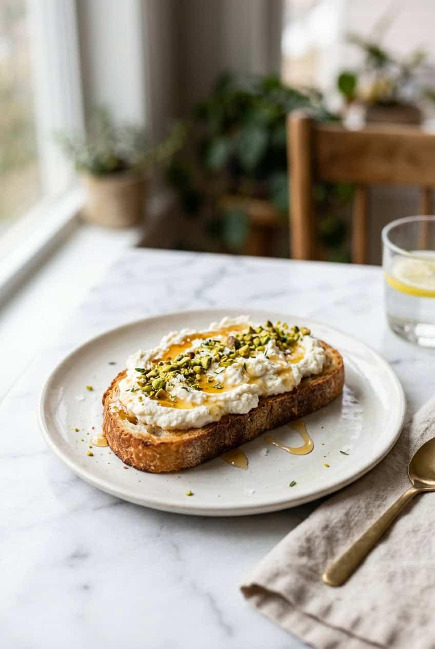 This toast works because whipping ricotta transforms it from grainy to silky smooth. The honey adds sweetness, the pistachios bring crunch, and a pinch of flaky salt ties it all together. It tastes like something from a trendy brunch spot but takes 5 minutes at home.